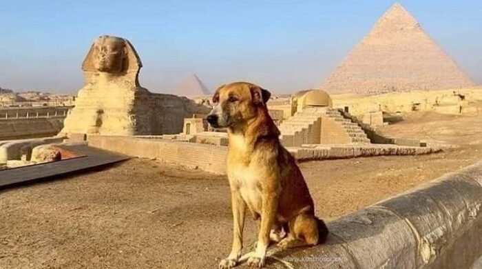 মিশরের দ্য গ্রেট পিরামিডের চূড়ায় কুকুর