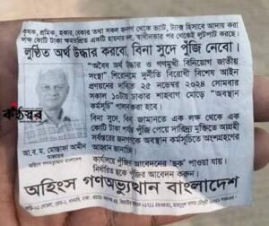 এ সময় তাদের কাছে কিছু প্রচারপত্র পাওয়া যায়। ‘অহিংস গণঅভ্যুত্থান বাংলাদেশ’ নামক এক প্ল্যাটফর্মের আহ্বায়ক আ.ব.ম. মোস্তাফা আমীনের ছবিসংবলিত ওই প্রচারপত্রে লেখা-লুণ্ঠিত অর্থ উদ্ধার করব, বিনা সুদে পুঁজি নেব। আরও লেখা ছিল- কৃষক, শ্রমিক, হকার, বেকার তথা সকল জনগণ থেকে ভ্যাট, ট্যাক্স হিসাবে আদায় করা লক্ষ-কোটি টাকা ক্ষমতাশ্রিত একটি হায়েনার দল, স্বাধীনতার পর থেকেই লুটপাট করছে।
