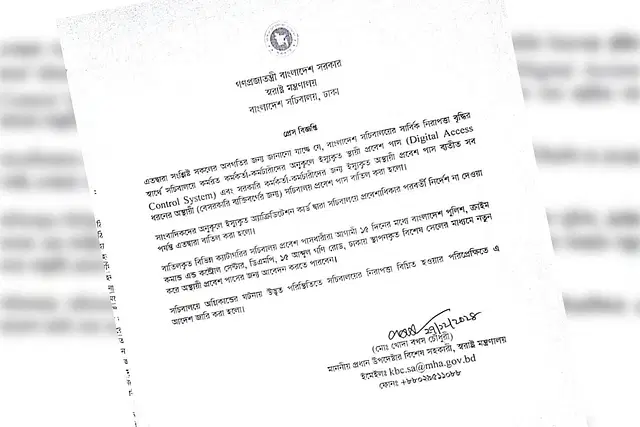 সচিবালয়ে অগ্নিকাণ্ডের ঘটনায় উদ্ভূত পরিস্থিতিতে সচিবালয়ের নিরাপত্তা বিঘ্নিত হওয়ার পরিপ্রেক্ষিতে এই আদেশ জারি করা হয়েছে বলে সংবাদ বিজ্ঞপ্তিতে উল্লেখ করা হয়। সেখানে আরও বলা হয়, বাংলাদেশ সচিবালয়ের সার্বিক নিরাপত্তা বৃদ্ধির স্বার্থে সচিবালয়ে কর্মরত কর্মকর্তা–কর্মচারীদের অনুকূলে দেওয়া স্থায়ী প্রবেশ পাস (ডিজিটাল এক্সেস কন্ট্রোল সিস্টেম) এবং সরকারি কর্মকর্তা–কর্মচারীদের জন্য দেওয়া অস্থায়ী প্রবেশ পাস ছাড়া সব ধরনের অস্থায়ী (বেসরকারি ব্যক্তিদের জন্য) সচিবালয় প্রবেশ পাস বাতিল করা হলো।