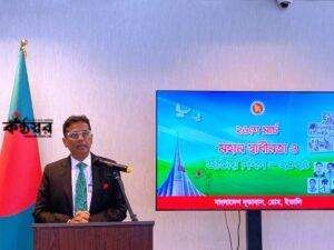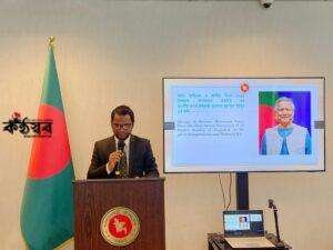রাষ্ট্রদূত রকিবুল হক তাঁর বক্তব্যে মহান স্বাধীনতা ও জাতীয় দিবসের তাৎপর্য তুলে ধরে কাঙ্খিত সুখী, সমৃদ্ধ, বৈষম্যমুক্ত বাংলাদেশ গঠনের মাধ্যমে স্বাধীনতার প্রকৃত অর্থ বাস্তবায়নে গুরুত্বারোপ করেন। তিনি মাননীয় প্রধান উপদেষ্টা প্রফেসর মুহাম্মদ ইউনূসের নেতৃত্বে গঠিত অন্তর্বর্তীকালীন সরকারের সকল উদ্যোগ বাস্তবায়নের জন্য সকলের সহযোগিতা কামনা করেন। তিনি দেশের অর্থনৈতিক উন্নয়নে প্রবাসী বাংলাদেশিদের অবদানের বিষয়ে গুরুত্বারোপ করেন এবং সকলকে বর্তমান সরকারের অনুসৃত নীতি অনুযায়ী প্রবাসীদের কল্যাণে কাজ করার জন্য অনুরোধ করেন। এ বিষয়ে দূতাবাসের কর্মকর্তাদের যথাযথ দায়িত্ব পালনের জন্য আহবান জানান।