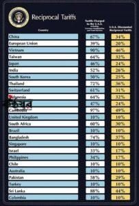 এ ছাড়া ইউরোপীয় ইউনিয়নের পণ্যের ওপর ২০ শতাংশ, ভিয়েতনামের পণ্যের ওপর ৪৬ শতাংশ, শ্রীলঙ্কার পণ্যে ৪৪ শতাংশ, তাইওয়ানের পণ্যে ৩২ শতাংশ, জাপানের পণ্যে ২৪ শতাংশ, দক্ষিণ কোরিয়ার পণ্যে ২৫ শতাংশ, থাইল্যান্ডের পণ্যে ৩৬ শতাংশ, সুইজারল্যান্ডের পণ্যে ৩১ শতাংশ, ইন্দোনেশিয়ার পণ্যে ৩২ শতাংশ, মালয়েশিয়ার পণ্যে ২৪ শতাংশ, কম্বোডিয়ার পণ্যে ৪৯ শতাংশ, যুক্তরাজ্যের পণ্যে ১০ শতাংশ, দক্ষিণ আফ্রিকার পণ্যে ৩০ শতাংশ, ব্রাজিলের পণ্যে ১০ শতাংশ, সিঙ্গাপুরের পণ্যে ১০ শতাংশ, ইসরায়েলের পণ্যে ১৭ শতাংশ, ফিলিপাইনের পণ্যে ১৭ শতাংশ, চিলির পণ্যে ১০ শতাংশ, অস্ট্রেলিয়ার পণ্যে ১০ শতাংশ, তুরস্কের পণ্যে ১০ শতাংশ, কলম্বিয়ার পণ্যে ১০ শতাংশ আরোপ করা হয়েছে।