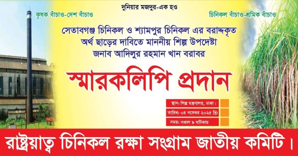 আগামী ০৪ নভেম্বর রোজ মঙ্গলবার সকাল ৯:০০ ঘটিকায় সেতাবগঞ্জ চিনিকল ও শ্যামপুর চিনিকলের বরাদ্দকৃত অর্থ অতি দ্রুত ছাড় করে এই অঞ্চলের আখ চাষী চিনিকল শ্রমিক ও গণমানুষের আকাঙ্খা পূরণ করতে ‘সেতাবগঞ্জ চিনিকল পুনঃচালনা আন্দোলন পরিষদের’ সংগ্রামী আহ্বায়ক মোঃ বদরুদ্দোজা (বাপন) এর নেতৃত্বে