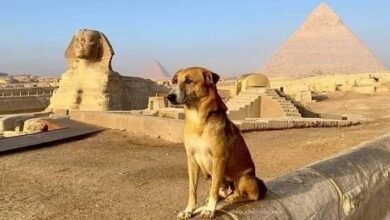 মিশরের দ্য গ্রেট পিরামিডের চূড়ায় কুকুর